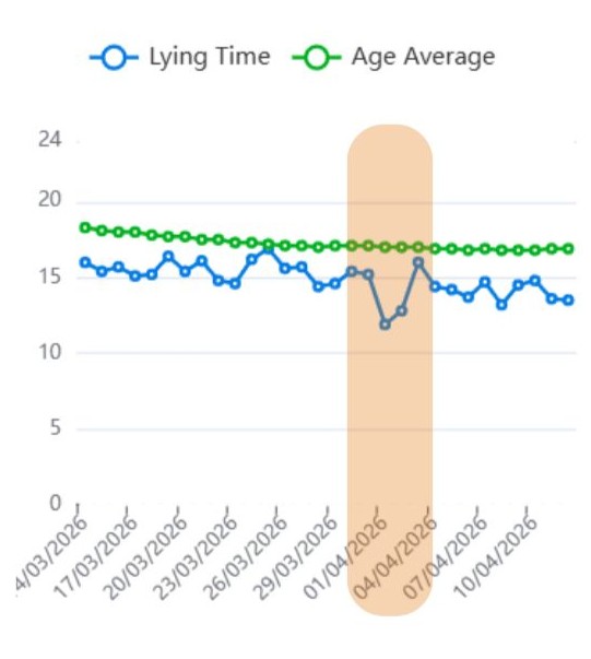This graph shows real data from the WellCalf app. The blue line show ear temperature readings for the individual animal, and green is the baseline for the whole group. As you can see, the two lines mostly closely track each other – but we’ve highlighted in orange a “blip” dated April 11th.