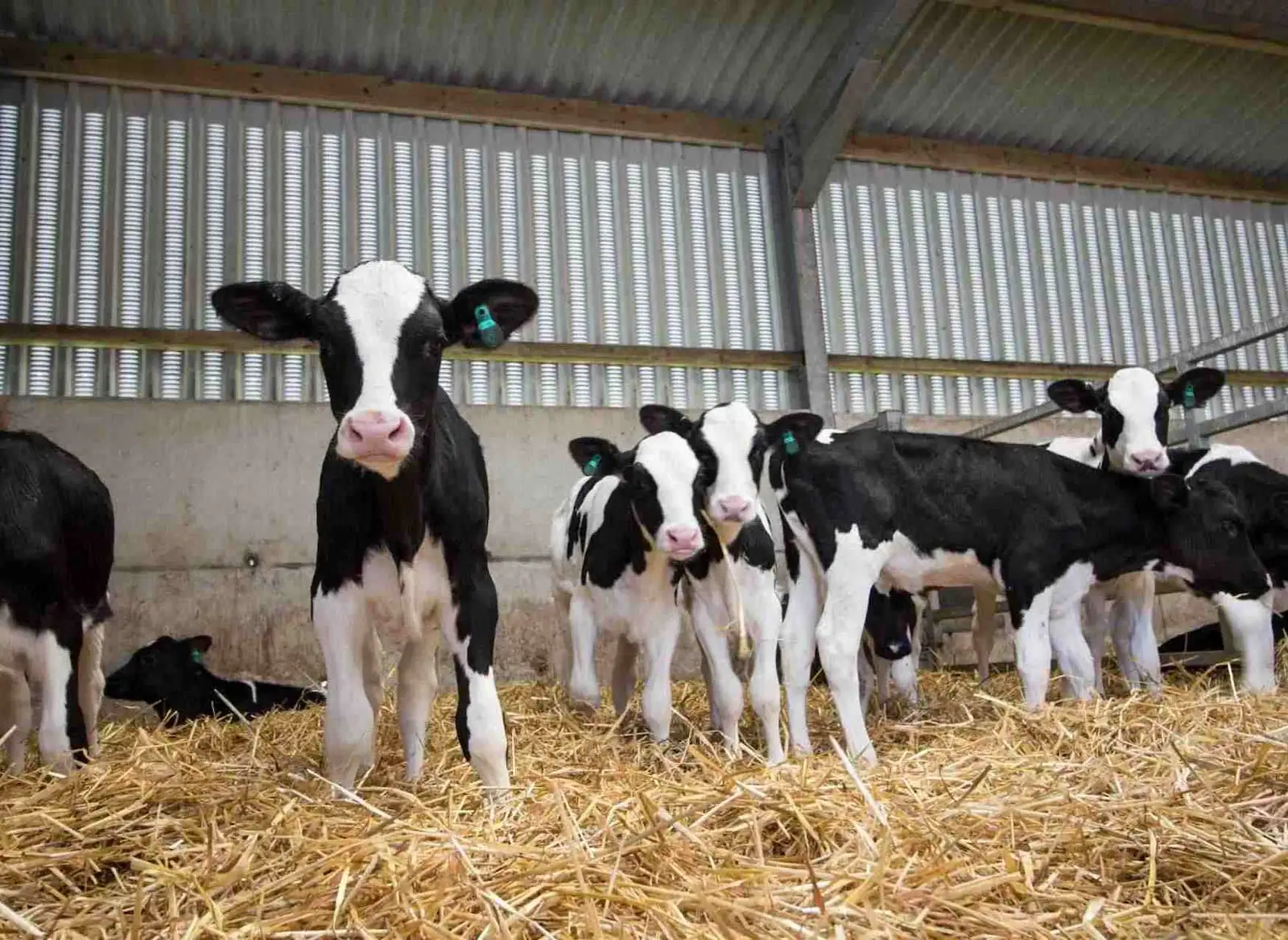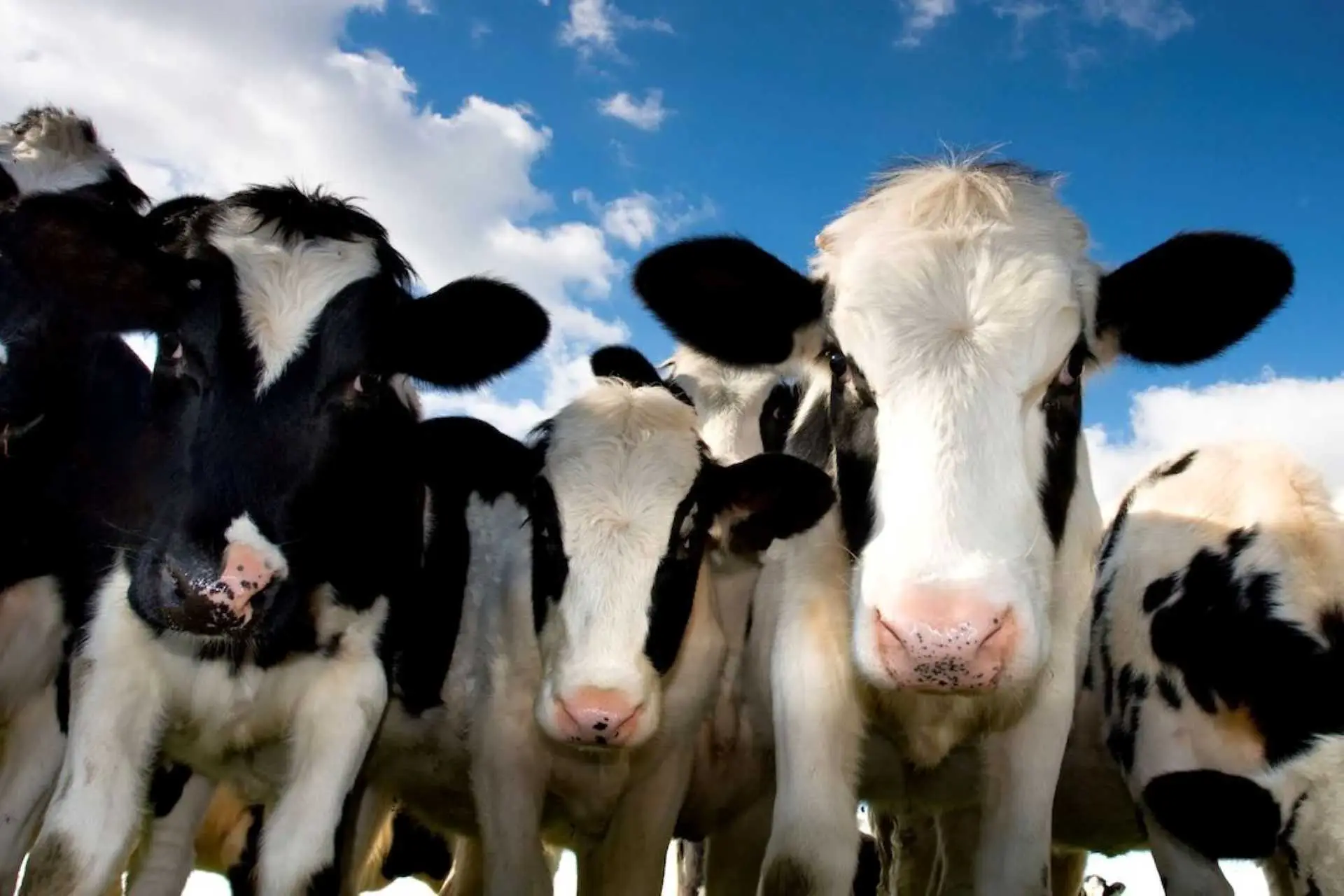 Calves outdoors with a blue sky. Smart monitoring can aid growth and prevent health issues like pneumonia and scours.