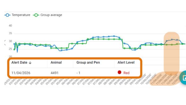 This graph shows real data from the WellCalf app. The blue line show ear temperature readings for the individual animal, and green is the baseline for the whole group. As you can see, the two lines mostly closely track each other – but we’ve highlighted in orange a “blip” dated April 11th.